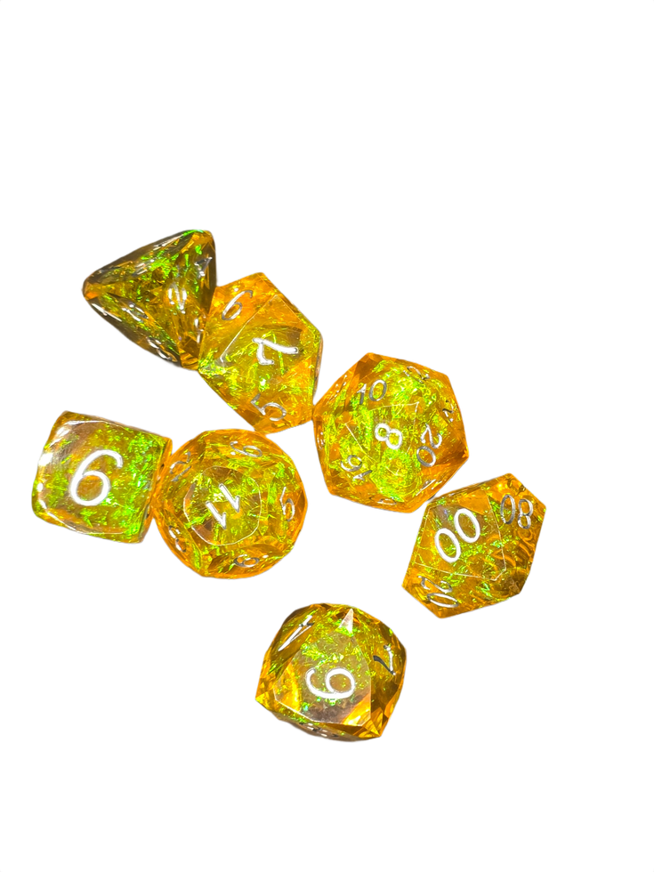 Resin made Gems of Healing Word 7 piece dice set for Dungeons & Dragons and other TTRPG and board games.