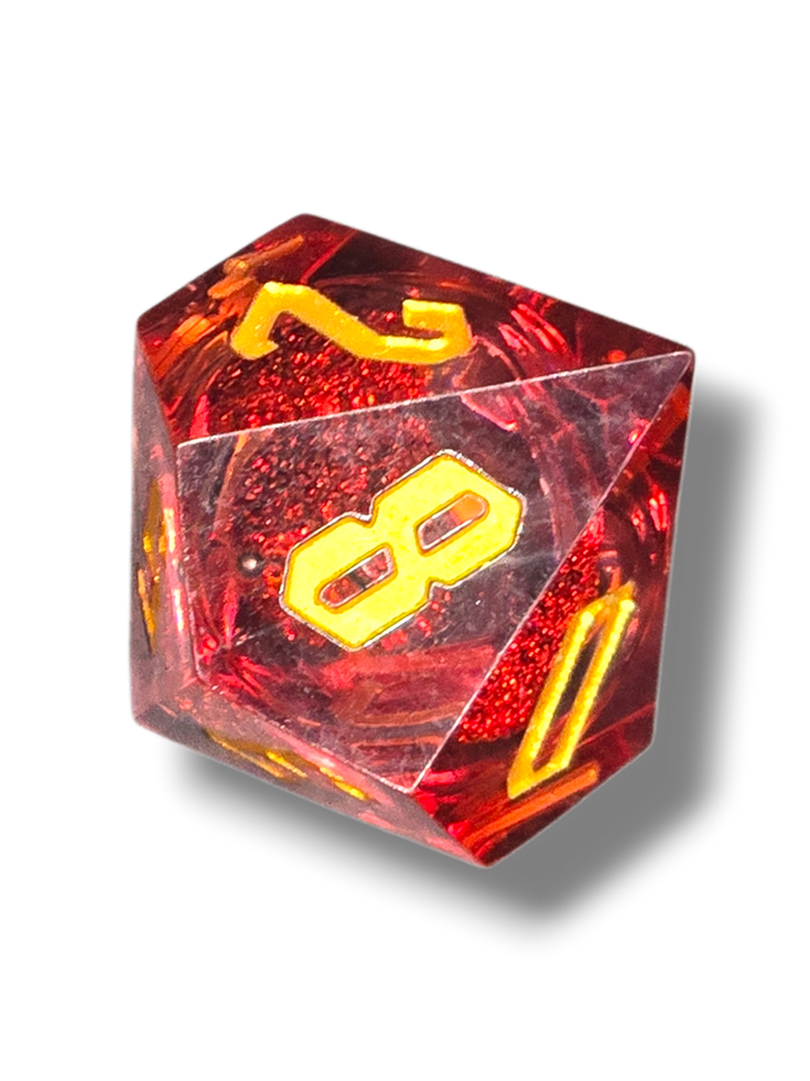Resin made Red Mascarade Liquid Core 7 Piece dice set for Dungeons & Dragons and other TTRPG and board games.