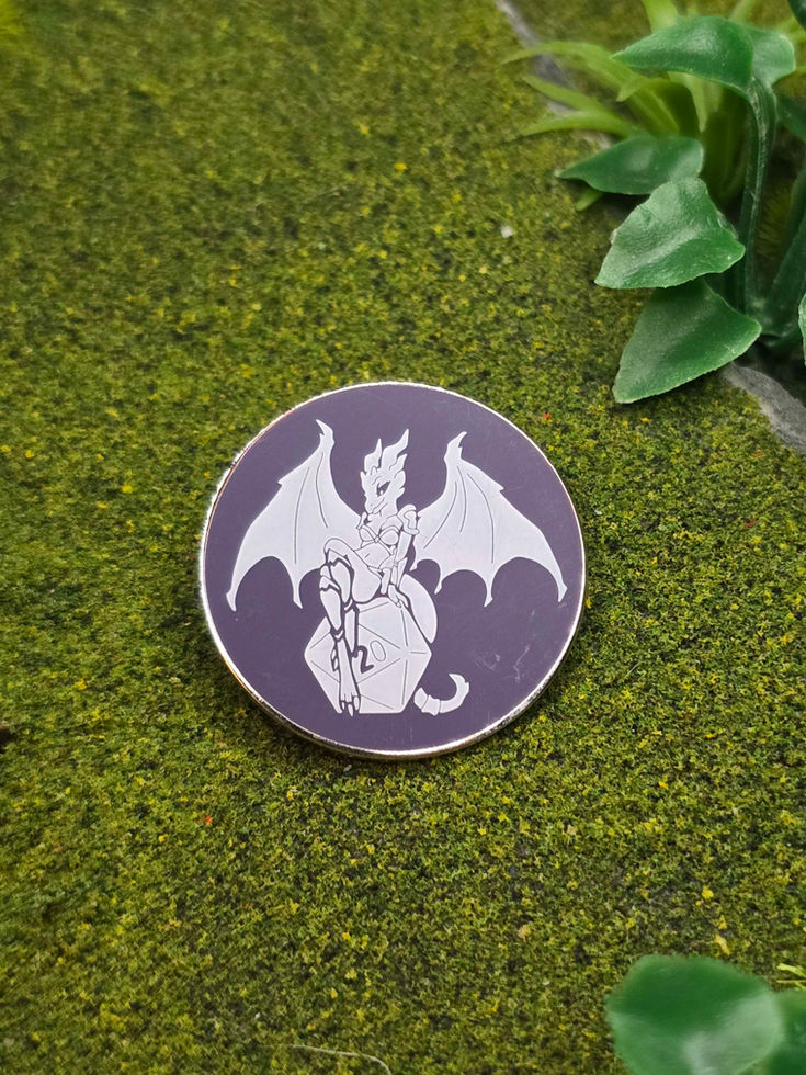 This intricate pin features a greyish blue pin with a Succubus pin-up style monster sitting on top of a D20. The detailed design and high-quality enamel make this pin a must-have for any Dungeons and Dragons player or Dungeon Master.